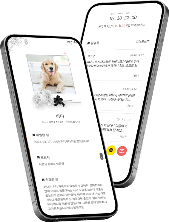 갑작스럽게 아이가 무지개다리를 건너 경황이 없었는데, 페티앙 덕분에 지인들에게 차분히 소식을 전할 수 있었습니다. 사진을 고르고 문구를 넣는 과정이 복잡하지 않아 슬픈 와중에도 쉽게 만들 수 있었어요.